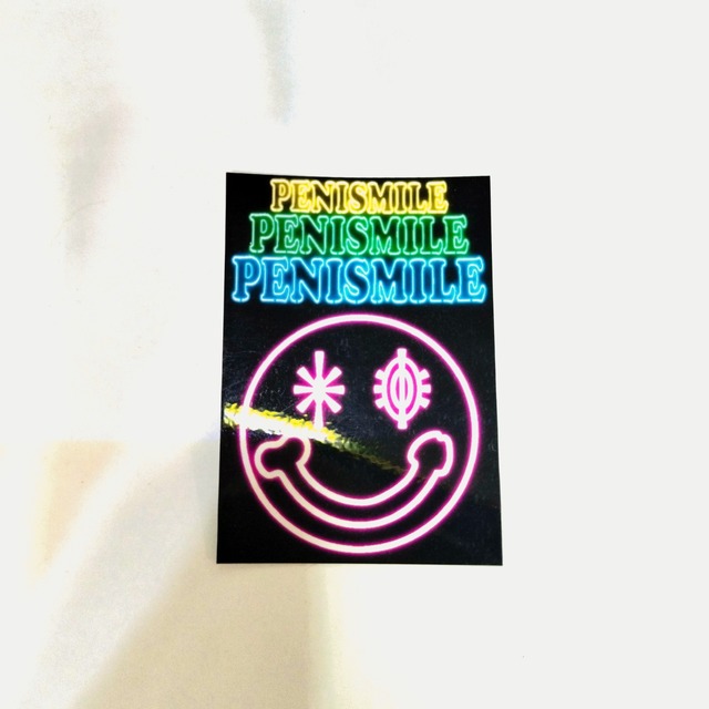 ペニスマイルネオンステッカーです。 Tシャツ用に作成したデザインで、色味がきれいなのと評判がいいので ステッカーにしました。 サイズ:74mm x 50mm 【ペニスマイルとは?】 【性の公平】をキャッチーに表現した作品です。 肛門、女性器、男性器、を単純化したイラストをスマイルマークに落とし込み図案化しました。 コンセプトを込めたアート作品と言っても間違いではありませんが、世界中の人の心に触れたいと 願う際、共通言語は「笑い」なのではないか、と考え、単純な面白さを狙っただけの作品でもあります。 作品中の女性器を表すアイコンは日本特有で、同時多発的に全国に浸透し、現在は大多数の日本人が 認知できるデザインです。 世界でも通じる他の2つの図案と合わせることで、この図案をグローバルスタンダードに加えたい、 という希望も込めております。 また、デザインの上からペニスをスマイルマークの口の部分にする配置がベストだということもあり、 「penis+smile」で「penismile」という造語が世界的にも意味の通じる造語となるため、 作品名は「ペニスマイル」としておりますが、現在の男性偏重という歪んだ世界のバランスを表してもいます。 いつの世からかは知りえませんが、性器を含む言葉は時に侮蔑の対象となっております。 しかし、性器や生理現象に欠かせない部位は本来、神聖であり、相手を蔑視するアイコンとして使用するのは、 これからの時代に合わない感覚なのではないかと考えております。 この考えのもと、現実では現状の性差別を解消すべく行動しておりますが、 性の公平がなしえた未来に「人対人」として笑いあえる社会を、ペニスマイルに込めております。