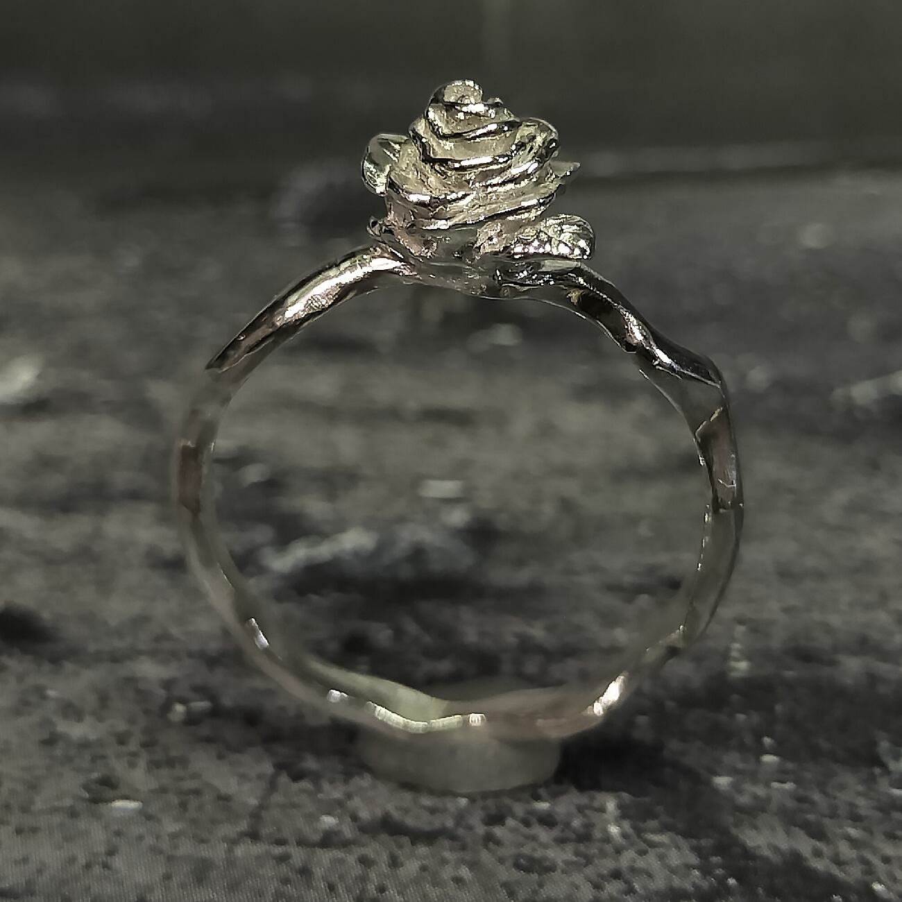 graviのラインナップにあったバラより少し大きく花弁が開いた造形で、一枚、葉がついたアンバランスな造形は、中指にメインで着けても、ピンキーや人差し指などサイドの指に着けてもしっくりきます。