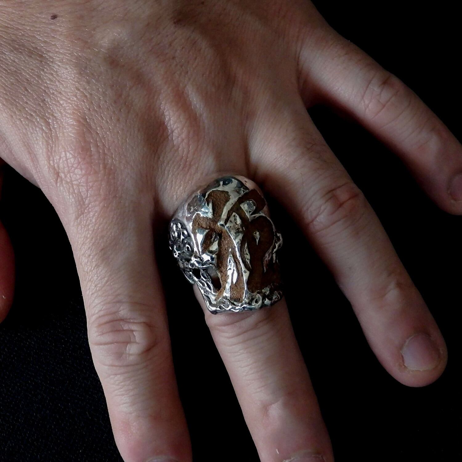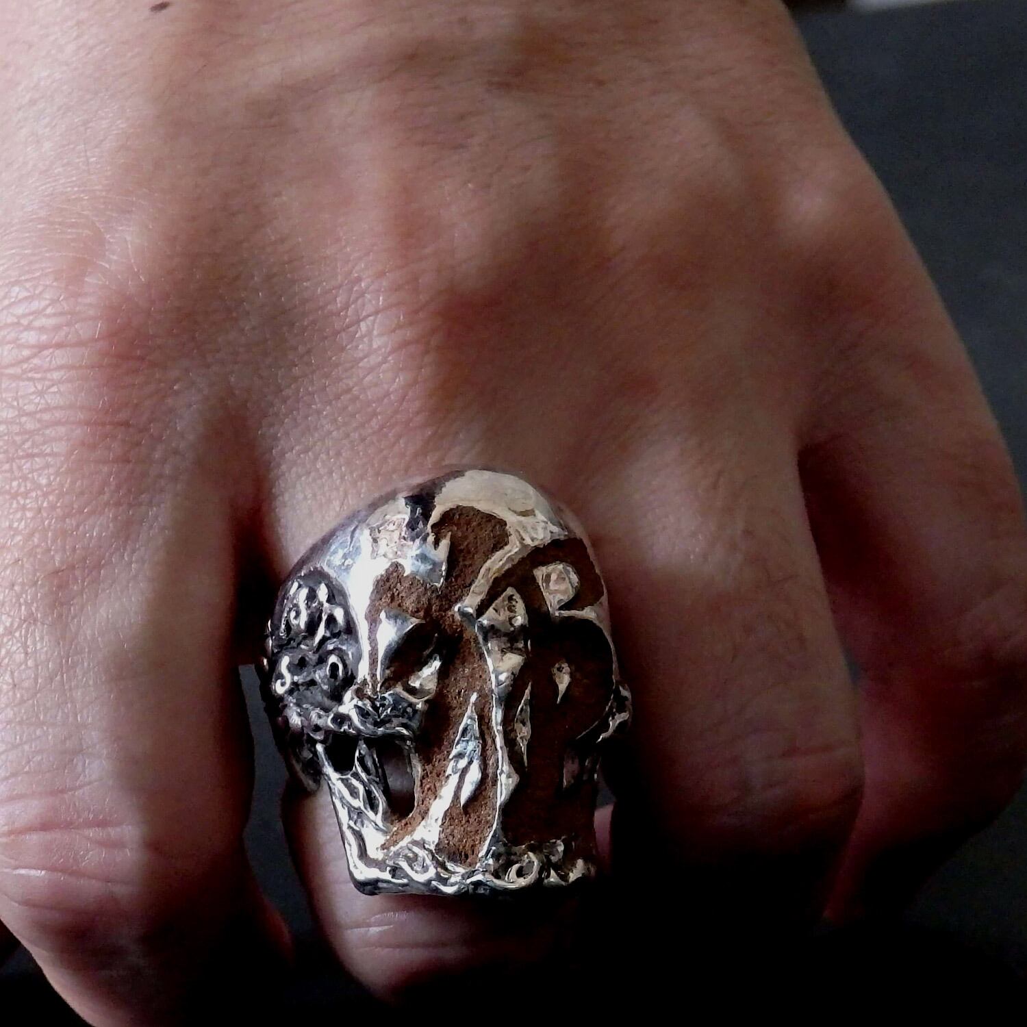これは漢字の「狂」をスカルのデザインに落とし込んだリングです。