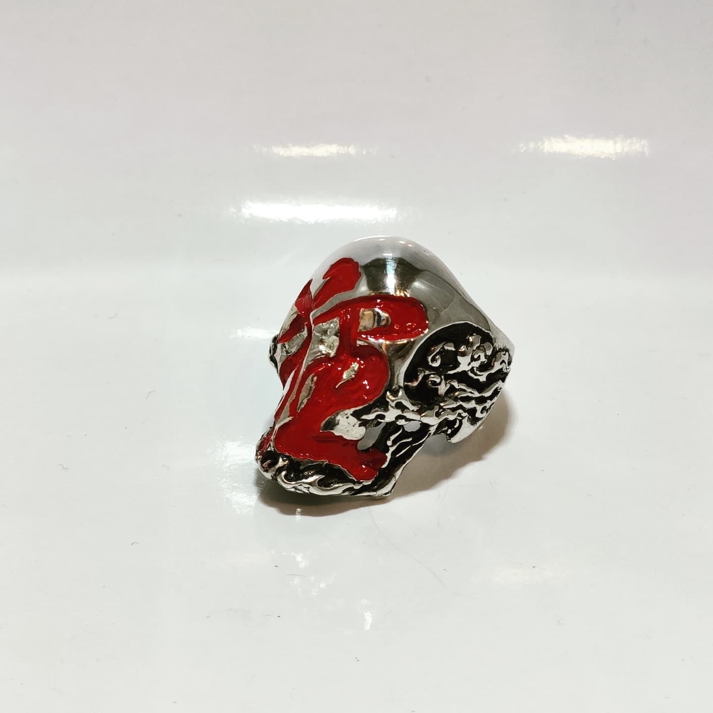 これは漢字の「狂」をスカルのデザインに落とし込んだリングです。