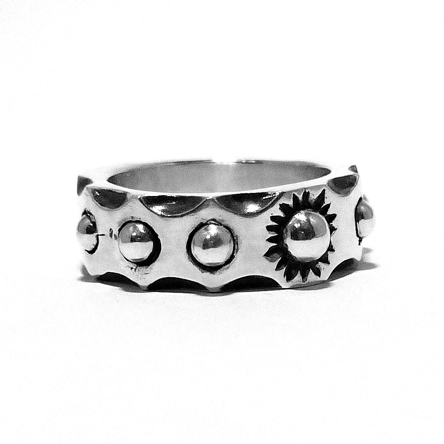 「球(きゅう)」をスタッズのように配したリングです。